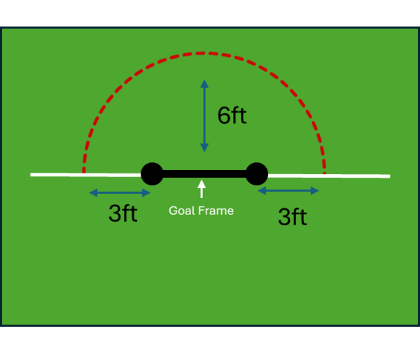 - The Goals will normally be 6 ft wide and 4 ft high. With a no-entry goal area comprising a semi circle, as follows: